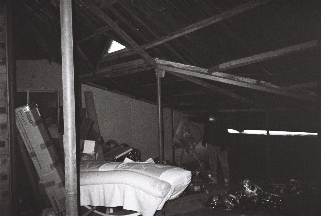 Beneath the pitched roof of an old lane house, just beyond the attic wall, lies an abandoned, in-between space, neither owned nor entirely disowned. Over time, past and present residents of the apartment have discarded unwanted furniture, empty bottles, and worn-out cardboard boxes here, a slow accumulation of remnants that transformed the space into a liminal storage of both material and memory. The only direct access is through the attic window. Each time an object is placed into this void, there is a fleeting sense of transgression, as if a fragment of the space has been stolen—despite belonging to no one.